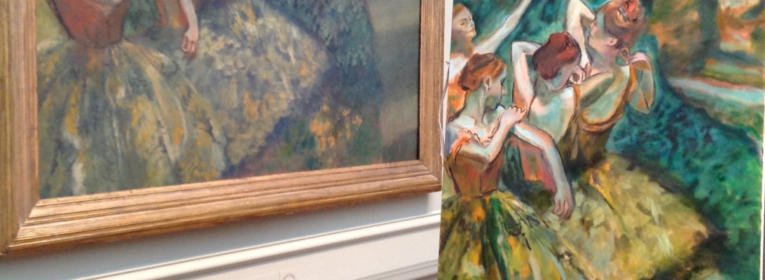 Work in progress. I’ve been working on this piece for five Tuesdays, approximately 22 hours. Lots of defining and details left to complete. I’m trying to imagine how the painting looked when Degas finished it. My feeling is that the colors he used were much brighter than the original looks today. The impressionist loved to paint the light so I can’t imagine he painted Four Dancers in such a dull, dark form.