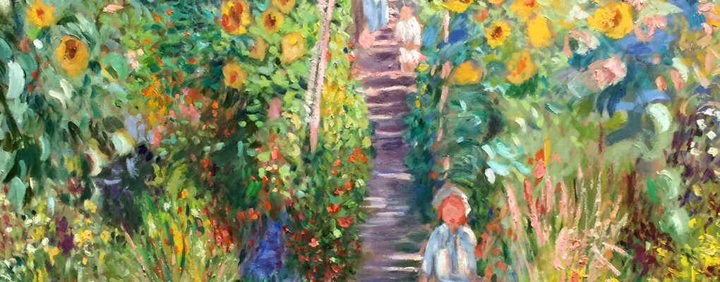 This painting shows his young son with his toy wagon very spontaneously described as are other members of his family on the steps leading to the house. Monet could create a 60″x 48″ painting in just a few hours in order to capture the days long shadows often leaving the viewer wondering what the object actually is or is that really a person on the steps that lead to the house?
