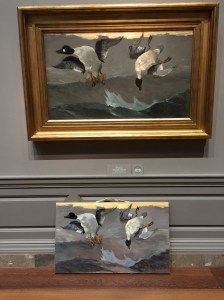 The painting depicts two ducks in flight attempting to avoid a hunters bullets. The one on the left although possibly injured continues its escape while the one on the right falls victim to the hunter. It is almost monochromatic with many shades of gray. The more I looked at it, the more colors I saw. The many degrees of value required much concentration. Homer used some very strong tints of greens mixed into the black feathers of the birds and it required strict observation to see it.